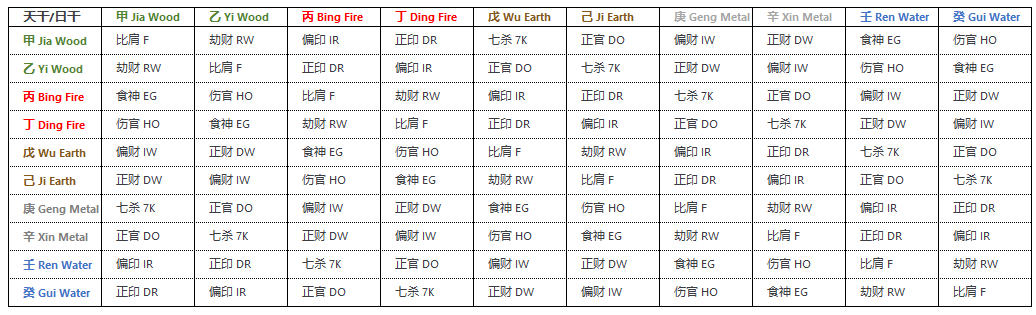 10 Gods table in relation to Day Master