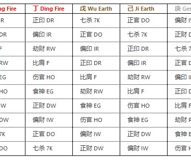 Relationship: Yin stem generates Yang self or Yang stem generates Yin self. For example, if I am Xin Metal, then Wu Earth is my Positive Seal; if I am Geng Metal, then Ji Earth is my Positive Seal.