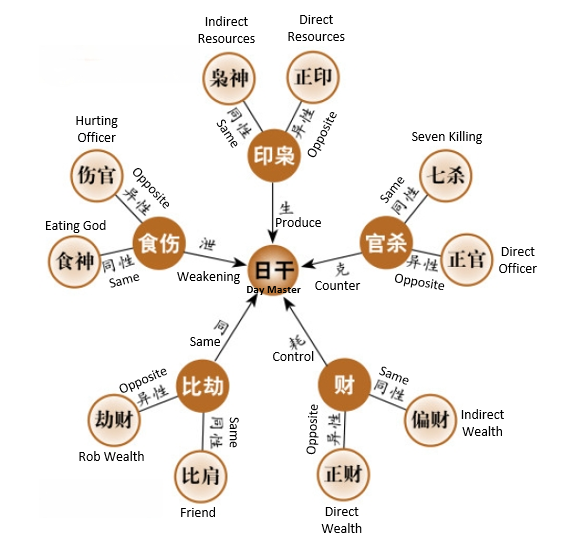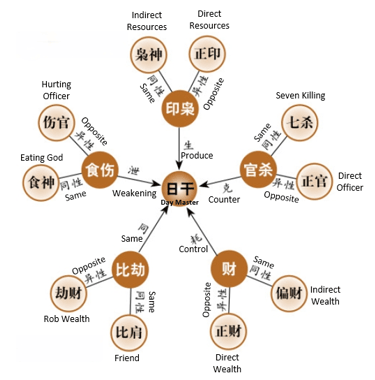 In the Four Pillars, the Heavenly Stem (abbreviated as 日干, literally "Day Master") of the Day Pillar is unique and can be understood as the "core" self: "I." All other Stems and Branches interact with it to produce the "Ten Gods" attributes. These are determined based on the Yin-Yang and Five Elements relationships of the Heavenly Stems: Friend, Rob Wealth, Hurting Officer, Eating God, Direct Wealth, Indirect Wealth, Direct Officer, 7 Killings (Indirect Officer), Direct Resource, and Indirect Resource. The relationships are classified as Yin and Yang interact. Same polarity with Day Master like Yin with Yin, it is the positive side of 10 God, Yin and Yang polarity with Day Master it is regarded as negative 10 God.